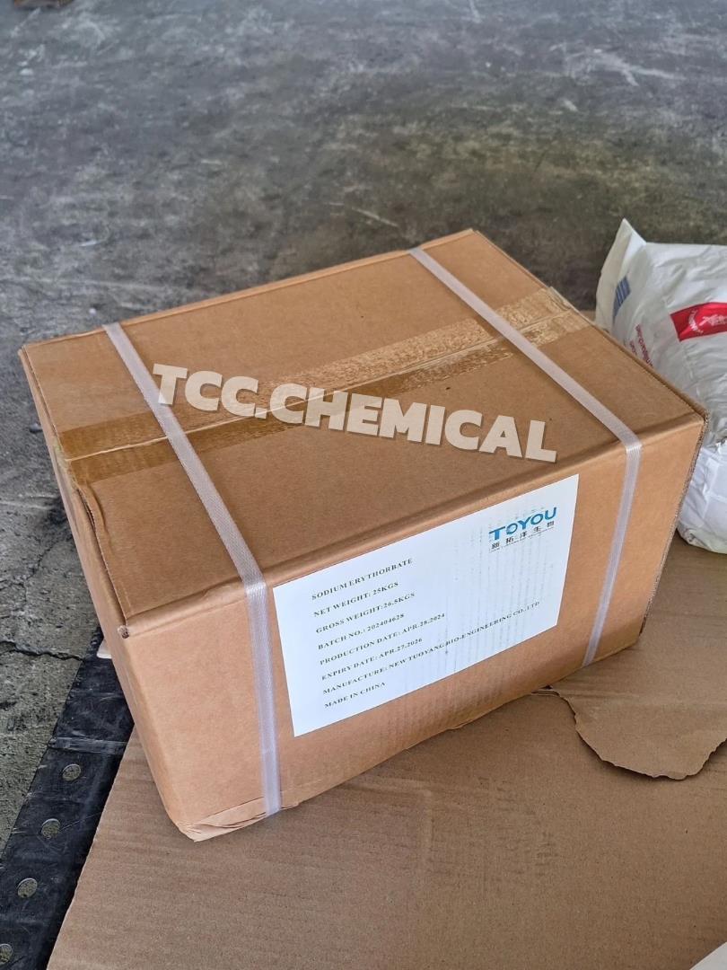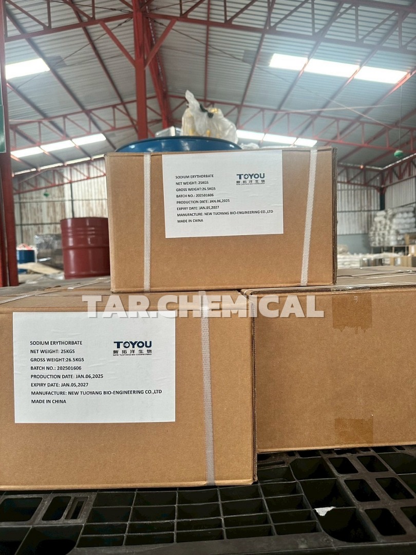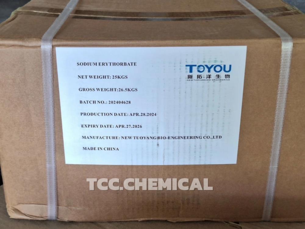 - โซเดียมอีริทอร์เบต (Sodium erythorbate) เป็นเกลือโซเดียมของกรดอีริทอร์เบต (erythorbic acid) ซึ่งมีโครงสร้างเกี่ยวข้องกับกรดแอสคอร์บิก (ascorbic acid) หรือ วิตามินซี (vitamin C) ผลิตได้จากน้ำตาลทราย (sucrose) ที่ได้จาก อ้อย หัวบีท หรือจากสตาร์ซ (starch)